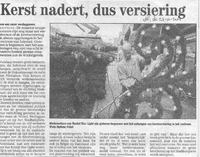 Gisteren konden centrumbezoekers en het winkelend publiek van de groene kerststukjes met verlichting genieten in onder meer de Wissel, Neringpassage en op het Stadhuisplein. Zo'n beetje om de vijf minuten Kwam er weer een rij verlichte versiersels bij in de stad.Lelystad is goed op tijd met het ophangen van de Kerstversiering, naar zeker niet de eerste stad in Nederland, laat een medewerker van Rental Star Light weten. hij is net bezig om alle electriciteitskabels netjes op te hangen langs de winkelgevels. 'We zijn namelijk al twee weken bezig in andere delen van het land. En ook in Belgie en Duitsland zijn we al volop aan het versieren. De reacties van het publiek waren gistermiddag erg wisselend.  De een vindt het 'wel mooi', een ander noemt het 'bespottelijk' dat er nu al weer aan kerst wordt gedacht. 'Het is nota bene nog maar herfstvakantie,' meldt iemand. 'En dan nu alweer kerst, sinterklaas, ik word er gek van.' Maar dat het een mooi gezicht is in de grauwe binnenstad, daar zijn de meesten het wel over eens. Nu maar snel afwachten wanneer de grote kerstboom op het Stadhuisplein wordt neergezet.
