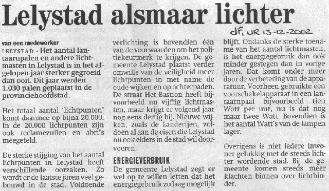 lichtpunten in Lelystad heeft verschillende oorzaken. Zo wordterde laatstejarenveelgebouwd in de stad. Voldoende verlichting is bovendien een van de voorwaarden om het politiekeurmerk te krijgen. De gemeente Lelystad plaatst verder omwille van de veiligheid meer lichtpunten in met name de oudewijken en op achterpaden. De straat Het Bastion heeft bijvoorbeeld nu vijftig lichtmasten, maar krijgt er volgend jaar nog eens dertig bij. Nieuwe wijken, zoals de Landerijen, voldoen al aan de eisen die Lelystad nu ook elders in de stad wil doorvoeren.ENERGIEVERBRUIK